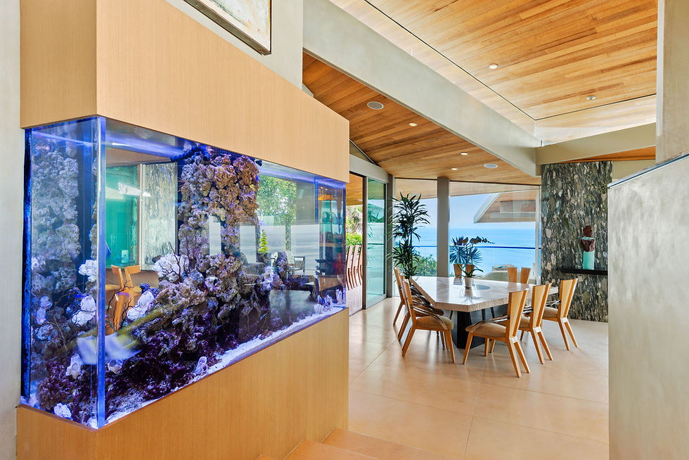 Surrounded by manicured, tropical landscaping visible from every room, the open-plan space has beautiful, exceptionally high, re-sawn cedar ceilings, polished granite interior walls, Beaumanière French limestone floors, sculpted carpeting, and enormous floor-to-ceiling windows and automated glass doors facing onto wraparound views. From the gated entry, a long, tree- and flower-lined drive leads past a tennis court to the covered garden courtyard entry. On the main level is an ocean-view great room with a raised fireplace, a large wet bar with counter seating, an intimate sitting area, a spacious living/family room, a dining area, and a lavish chef’s kitchen with a large island, high-end appliances, a generous pantry, and a sparkling saltwater aquarium.